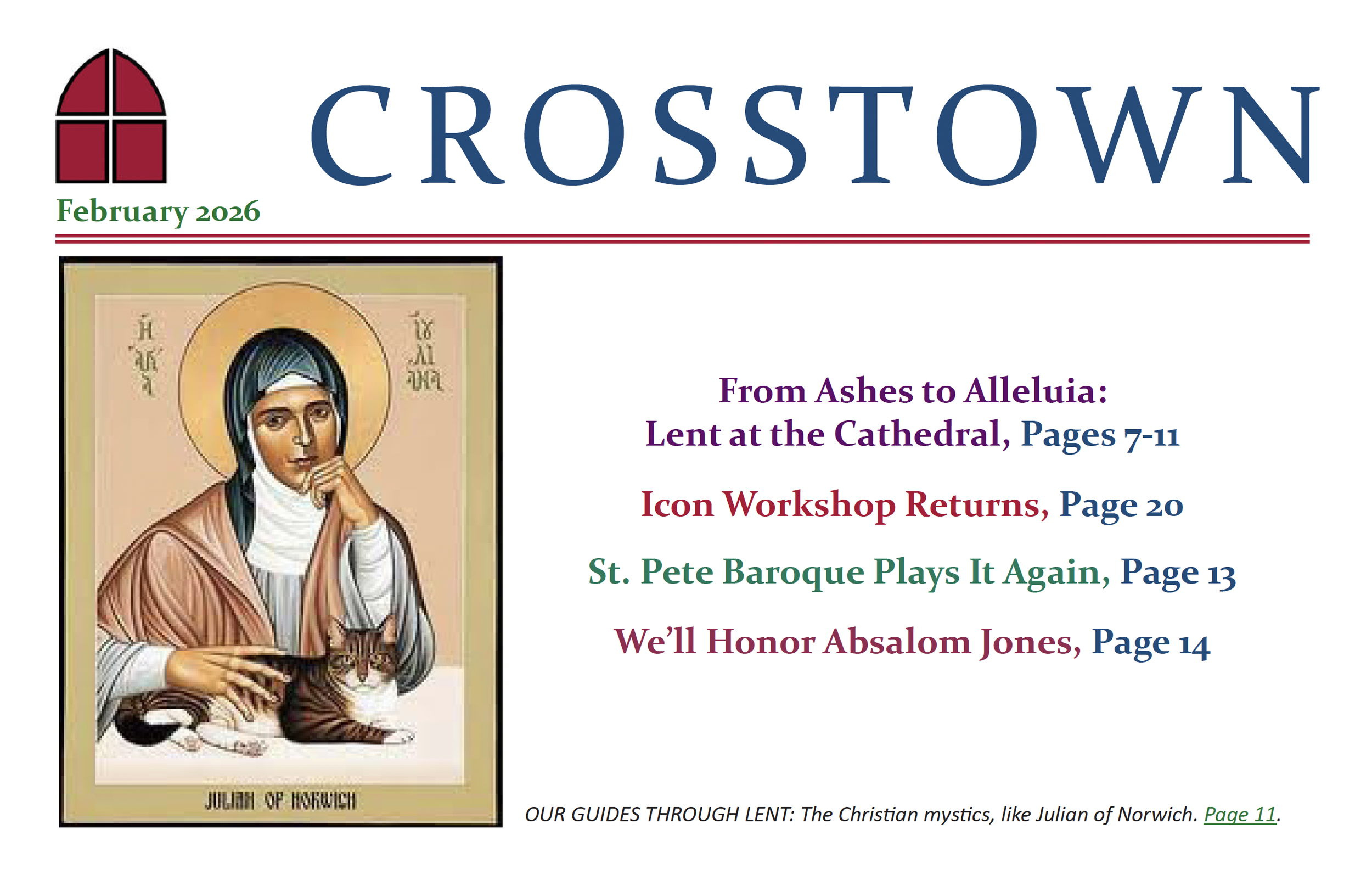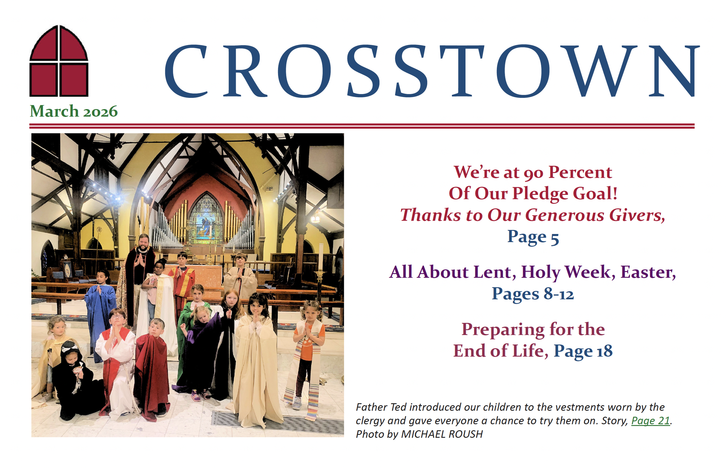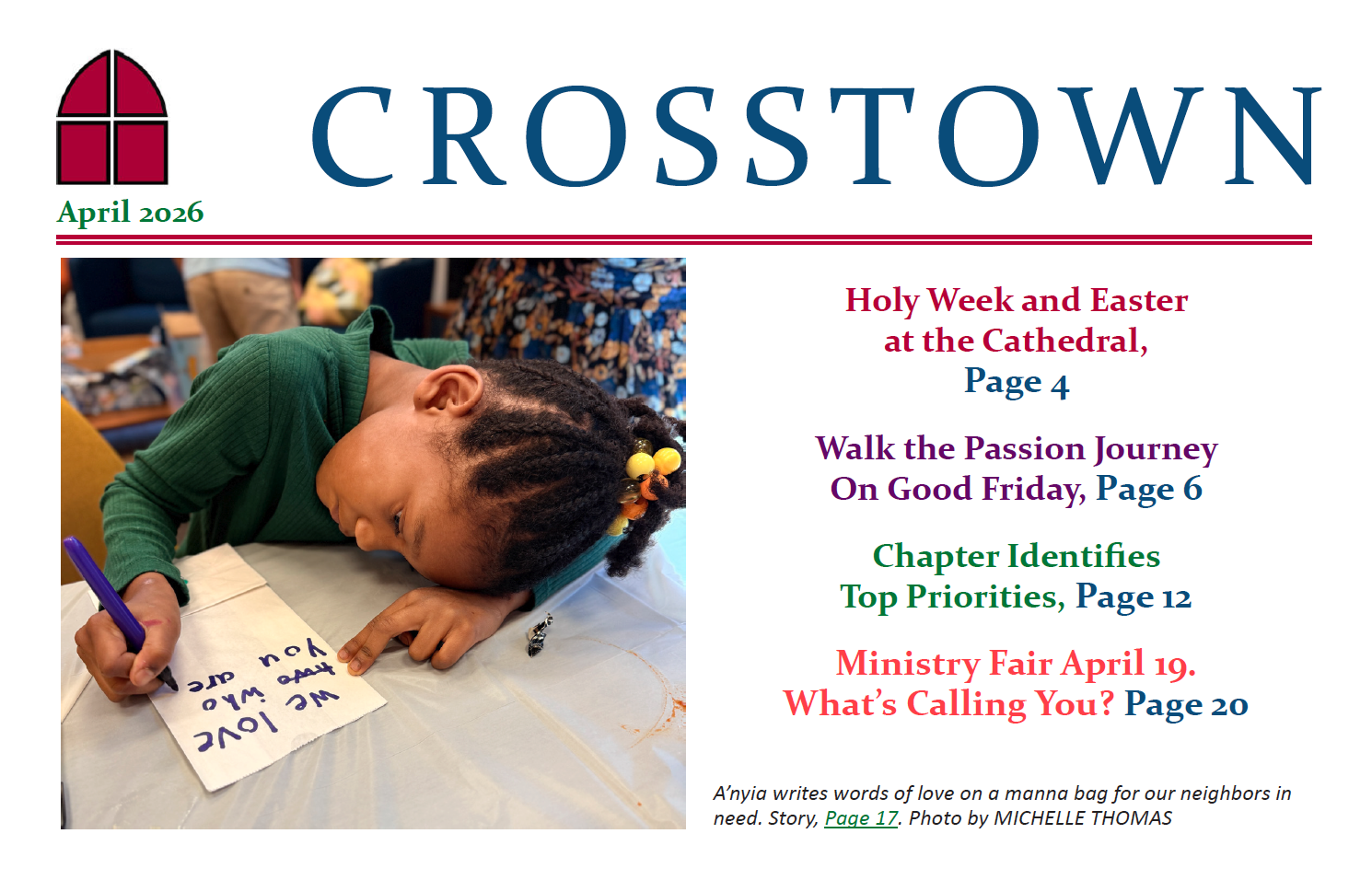 If you would like to receive an electronic copy of the monthly Crosstown newsletter, please email Michelle Thomas. Paper copies are available at the Cathedral at the Front Desk and in Harvard Hall.