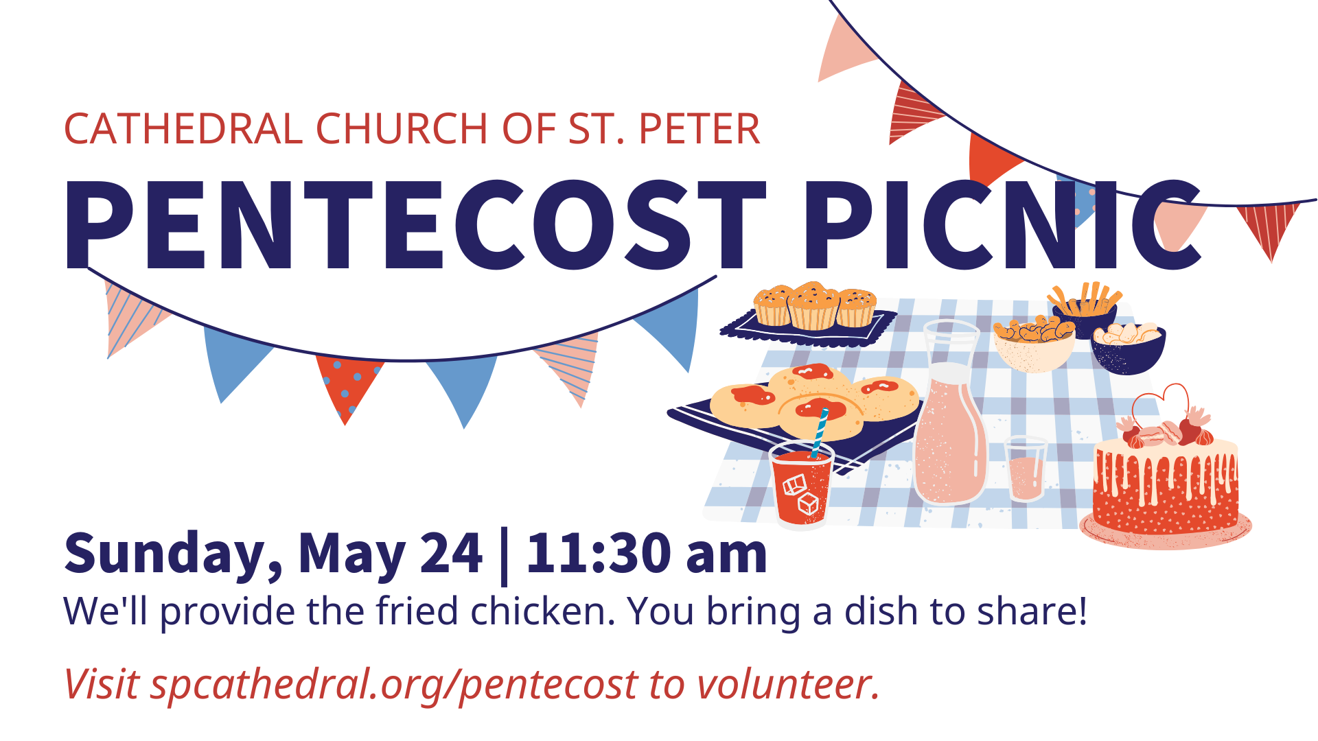 Join us Sunday, May 24, after the 10:15 am service for a potluck lunch, and activities for all ages. The Cathedral will provide fried chicken; you’re invited to bring a dish to share.