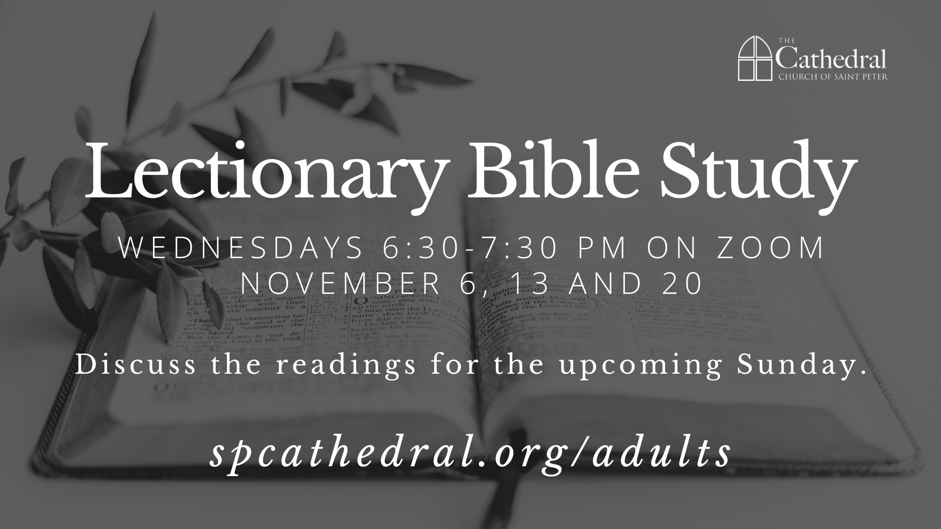 Join Canon Mike Alford on Wednesday evenings at 6:30 pm on Zoom for a lectionary Bible study. Spend some time reflecting on the scriptures for the upcoming Sunday and engage in discussion and conversation with fellow Cathedral members.